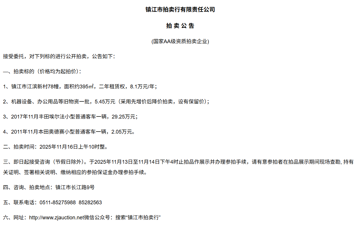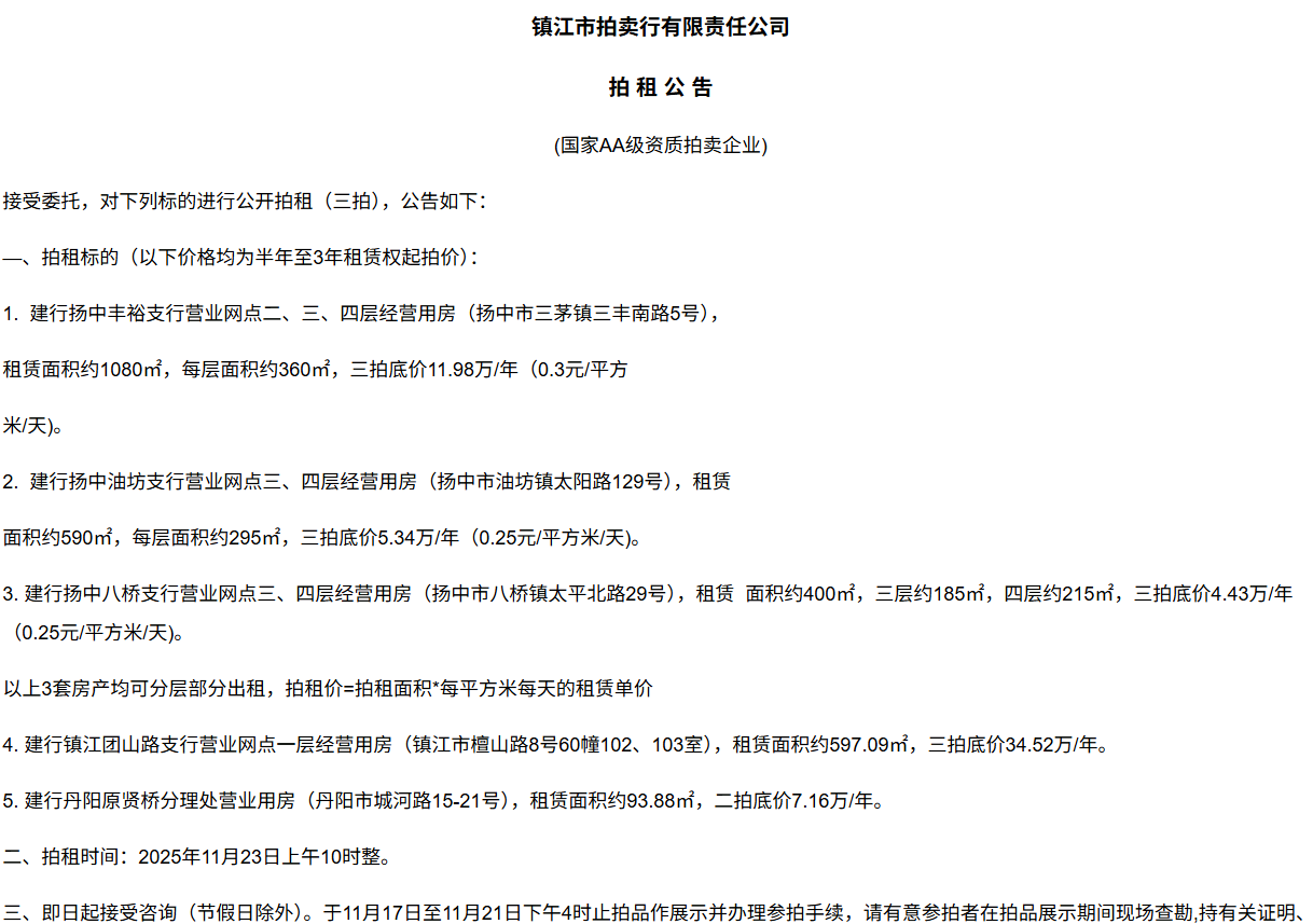 鎮江市拍賣行有限責任公司拍 租 公 吿(國家AA級資質拍賣企業)接受委托,對下列標的進行公開拍租(三拍),公告如下:—、拍租標的(以下價格均為半年至3年租賃權起拍價):1.  建行揚中豐裕支行營業網點二、三、四層經營用房(揚中市三茅鎮三豐南路5號),租賃面積約1080㎡,每層面積約360㎡,三拍底價11.98萬/年(0.3元/平方米/天)。2.  建行揚中油坊支行營業網點三、四層經營用房(揚中市油坊鎮太陽路129號),租賃面積約590㎡,每層面積約295㎡,三拍底價5.34萬/年(0.25元/平方米/天)。3. 建行揚中八橋支行營業網點三、四層經營用房(揚中市八橋鎮太平北路29號),租賃  面積約400㎡,三層約185㎡,四層約215㎡,三拍底價4.43萬/年(0.25元/平方米/天)。以上3套房產均可分層部分出租,拍租價=拍租面積*每平方米每天的租賃單價4. 建行鎮江團山路支行營業網點一層經營用房(鎮江市檀山路8號60幢102、103室),租賃面積約597.09㎡,三拍底價34.52萬/年。5. 建行丹陽原賢橋分理處營業用房(丹陽市城河路15-21號),租賃面積約93.88㎡,二拍底價7.16萬/年。二、拍租時間:2025年11月23日上午10時整。三、即日起接受咨詢(節假日除外)。于11月17日至11月21日下午4時止拍品作展示并辦理參拍手續,請有意參拍者在拍品展示期間現場查勘,持有關證明、簽署相關說明、繳納相應的參拍保證金辦理參拍手續。四、咨詢、拍租地點:鎮江市長江路9號五、聯系方式:0511-85275988   13655299933楊先生六、網址:http://www_zjauction_net.brasil20.com;微信公眾號:搜索“鎮江市拍賣行” 拍品清單2025.11.23序號名稱起拍價(元)標的說明1建行揚中豐裕支行營業網點二、三、四層經營用房(揚中市三茅鎮三豐南路5號),租賃面積約1080㎡,每層面積約360㎡三拍底價11.98萬/年(0.3元/平方米/天)1、1-3號房產均可分層部分出租,拍租價=拍租面積*每平方米每天的租賃單價;2、意向競拍人在拍賣前需持營業執照或身份證與委托方說明租賃房產經營業態,確定意向后出具房產承租用途承諾書,經委托方審核后,方可交納保證金參加競拍;3、租賃期限為半年至3年(承租方與出租方協商而定),承租方每半年或一年結付租金,租賃期間的水、電費用及其它相關費用均由承租方承擔;4、承租方不得用于經營和保管危險物品,不得用于開設餐飲、娛樂等可能嚴重影響消防安全、運營安全的經營業態,不得用于經營委托貸款、小額貸款等可能冒用委托方名義,帶來聲譽風險的經營業態。租賃期內,承租方不得破壞墻體結構,自行成就消防、安全等使用條件,不得擅自將租賃房屋轉租、轉讓給他人使用,否則委托方有權收回房屋;5、拍租成交后,承租方將租金交至出租方指定賬戶,傭金交至拍賣方賬戶(拍租傭金為該房屋一個月租金)。承租方憑租賃合同無息退還保證金。2建行揚中油坊支行營業網點三、四層經營用房(揚中市油坊鎮太陽路129號),租賃面積約590㎡,每層面積約295㎡三拍底價5.34萬/年(0.25元/平方米/天)3建行揚中八橋支行營業網點三、四層經營用房(揚中市八橋鎮太平北路29號),租賃面積約490㎡,每層面積約245㎡三拍底價4.43萬/年(0.25元/平方米/天)4建行鎮江團山路支行營業網點一層經營用房(鎮江市檀山路8號60幢102、103室),建筑面積約597.09㎡三拍底價34.52萬/年5建行丹陽原賢橋分理處營業用房(丹陽市城河路15-21號),建筑面積約93.88㎡二拍底價7.16萬/年